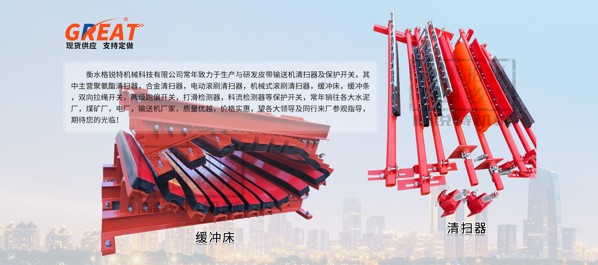 衡水格銳特機(jī)械科技有限公司常年致力于生產(chǎn)與研發(fā)皮帶輸送機(jī)清掃器及保護(hù)開(kāi)關(guān),其中主營(yíng)聚氨酯清掃器,合金清掃器,電動(dòng)滾刷清掃器,機(jī)械式滾刷清掃器,緩沖床,緩沖條,雙向拉繩開(kāi)關(guān),兩級(jí)跑偏開(kāi)關(guān),打滑檢測(cè)器,料流檢測(cè)器等保護(hù)開(kāi)關(guān),常年銷(xiāo)往各大水泥廠(chǎng),煤礦廠(chǎng),電廠(chǎng),輸送機(jī)廠(chǎng)家,質(zhì)量?jī)?yōu)越,價(jià)格實(shí)惠,望各大領(lǐng)導(dǎo)及同行來(lái)廠(chǎng)參觀(guān)指導(dǎo),期待您的光臨!??!